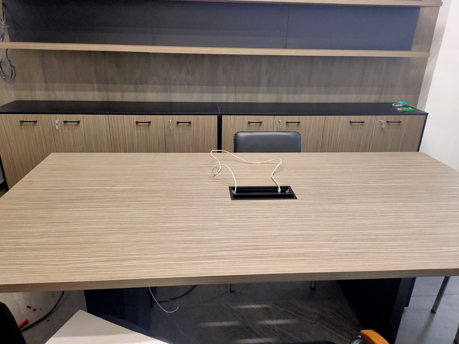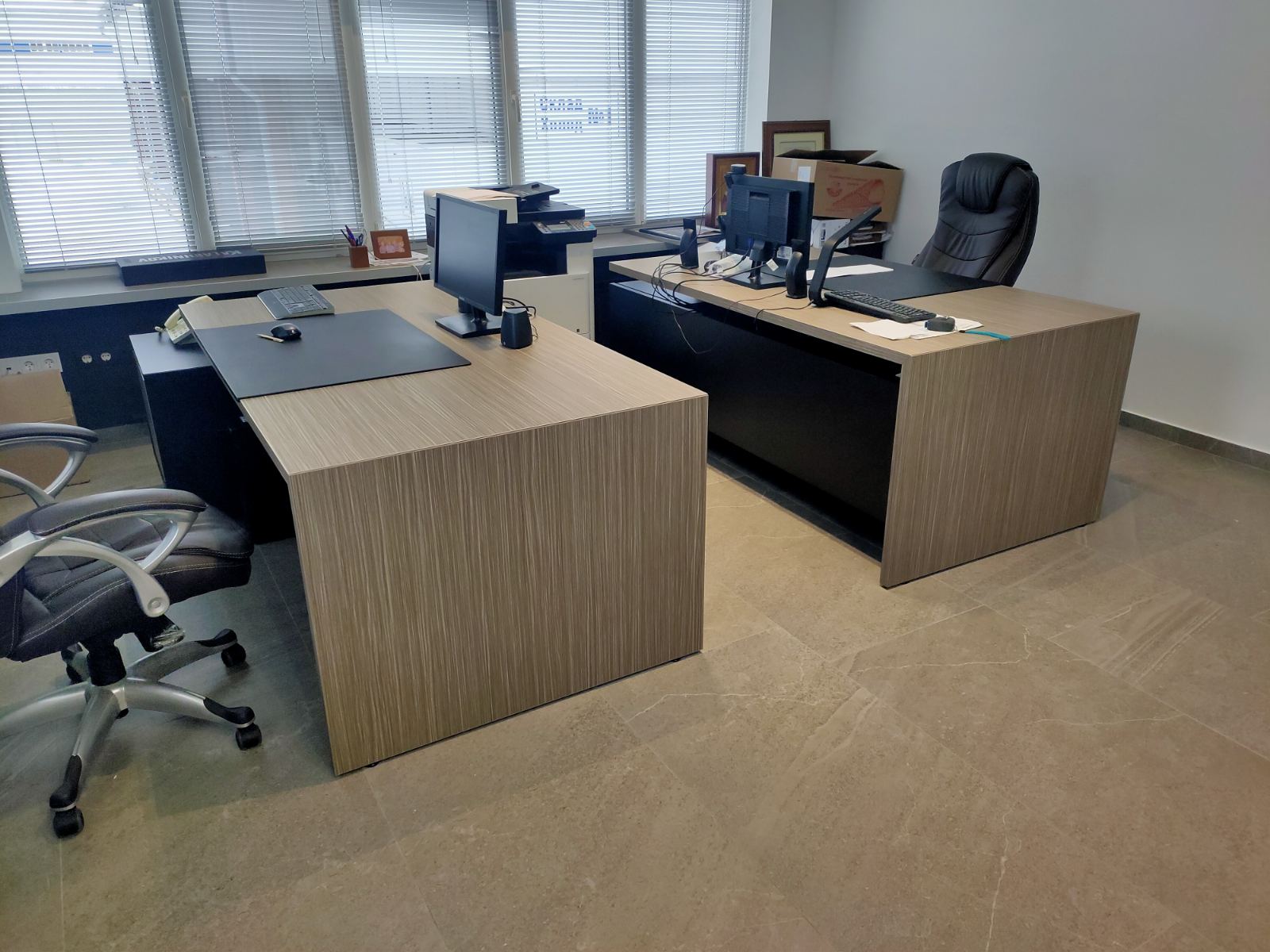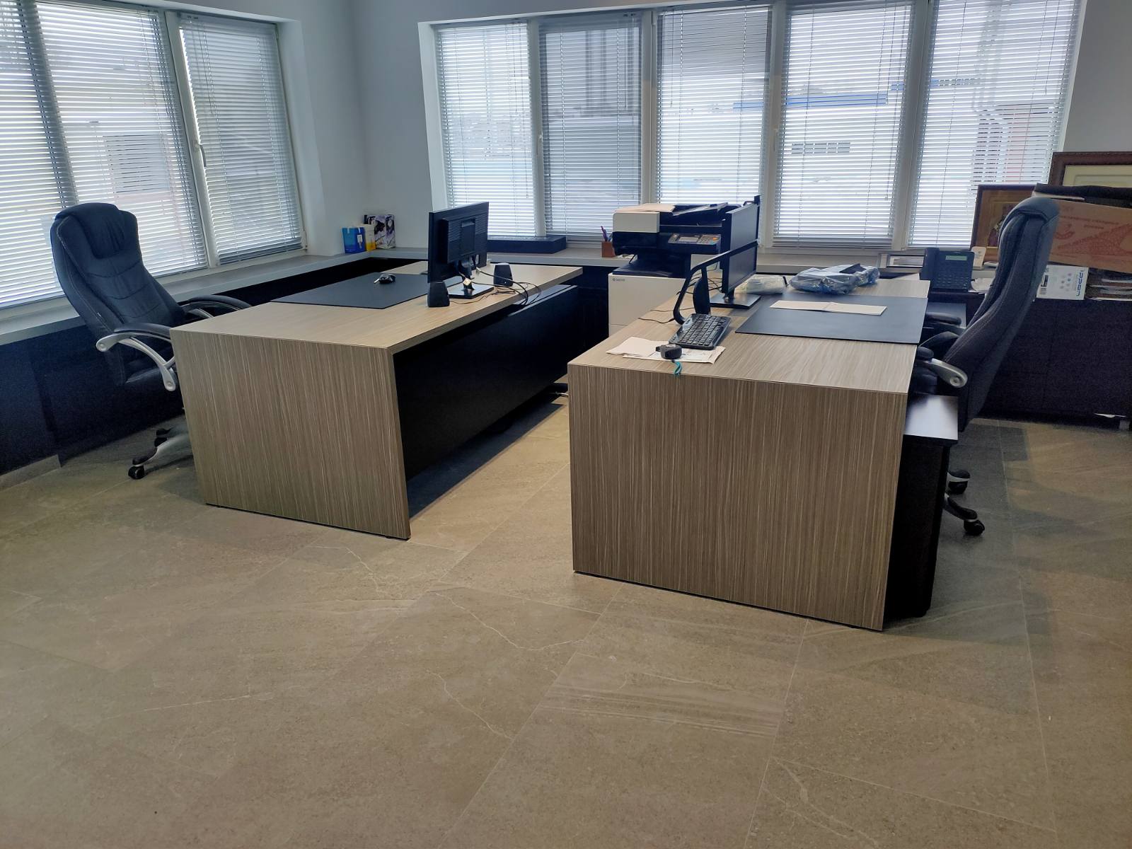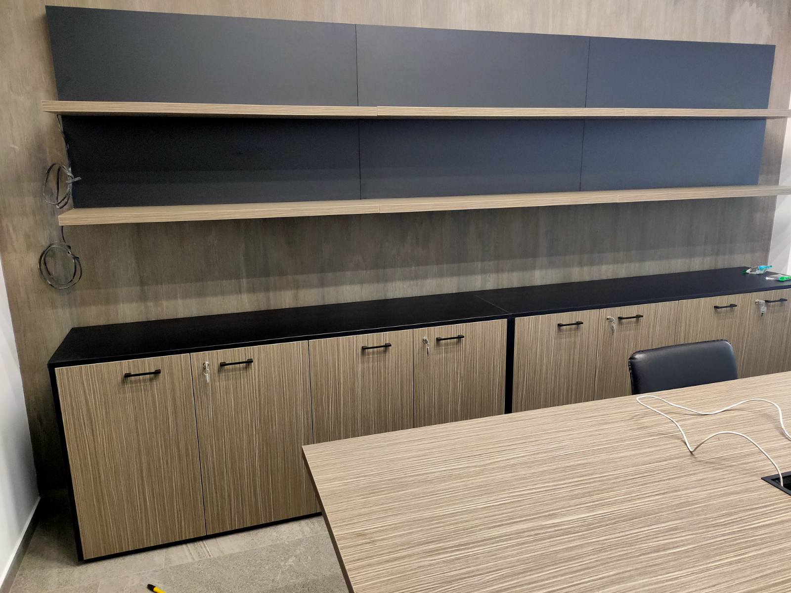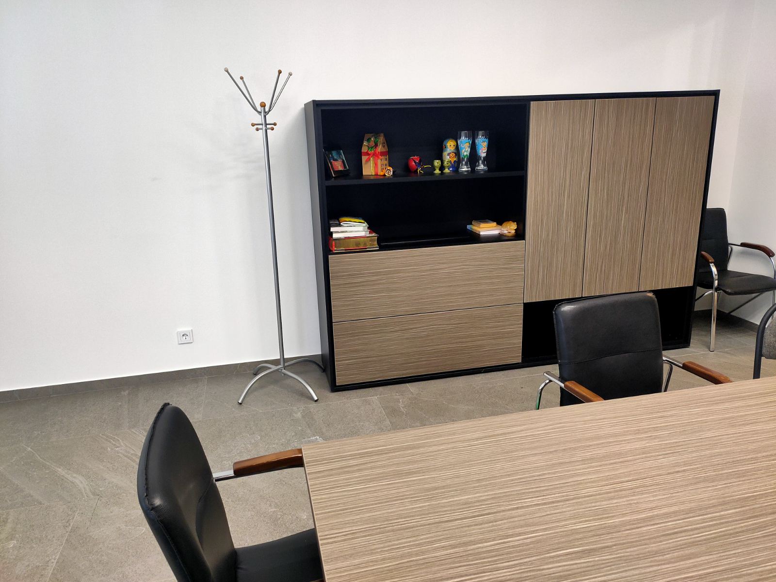 Руководителю хотелось оборудовать для себя и своих заместителей удобный, практичный и элегантный кабинет, который выглядел бы современно во все времена. Для таких задач был подобран итальянский кабинет в нейтральном оттенке натурального дерева, но вставки из черных материалов придают современный и даже дерзкий вид, что отлично подчеркивает современный подход компании к ведению бизнеса. Были созданы два комфортных рабочих места для руководителя и его заместителя, а так же зона переговоров в интересной стенкой, в которой встроена подсветка для эффекта парирования полок.
